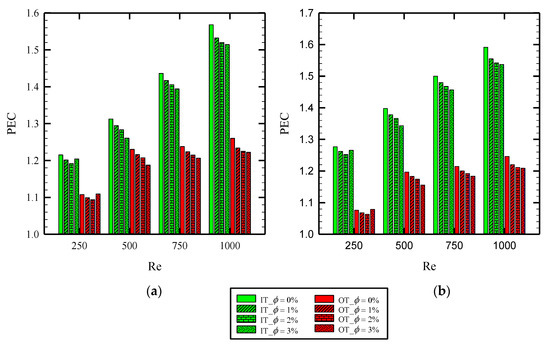 As discussed above, the twisted tape inserts augment both the heat transfer rate as a desirable objective and friction coefficient as an undesirable parameter. Therefore, there is a trade-off between the benefits of using twisted tape in thermal performance enhancement and the side effects in forcing more pumping power to the system. To analyze this issue, the dimensionless PEC introduced in Equation (21) is discussed here. In fact, this number is employed to evaluate the practical use of any enhancement techniques in the viewpoint of energy-saving potential. Generally, higher values of PEC imply superior energy saving. Figure 14 illustrates the PEC parameter for PHE, Co-SST, and Counter-SST at the inner and outer tubes. Using nanofluid and increasing its volume concentration results in higher PEC values showing more enhanced heat transfer than enhanced friction coefficient in such configurations. In addition, it can be observed that, for a higher Reynolds number, the PEC number enhances as well, implying better energy saving in higher velocities of the inlet fluid flowing through both inner and outer tubes. Moreover, the figure shows that the Counter-STT model yields higher PEC values compared with that for the Co-STT model in all Reynolds numbers and nanofluid volume concentrations. Ultimately, the highest value of PEC number is equal to 1.40 and 1.26 in the inner and outer tubes, which are found at Re = 1000, the volume fraction of 3%, and Counter-STT model.