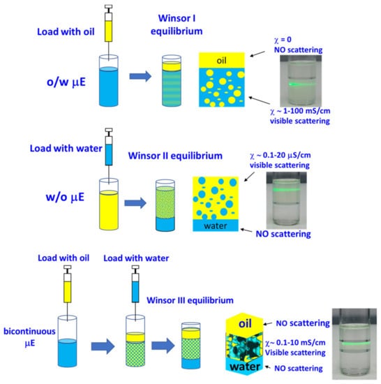 This scheme shows the fates of different perturbed μEs. Adding oil to oil-in-water (o/w) μE leads to a Winsor I regime, while when loading with water w/o μE, a Winsor II regime occurs. Bicontinuous μEs will reject both oil and water when loaded forming a Winsor III system. The photos on the right side display the behavior of different systems hit by a laser pointer. χ denotes the conductivity.