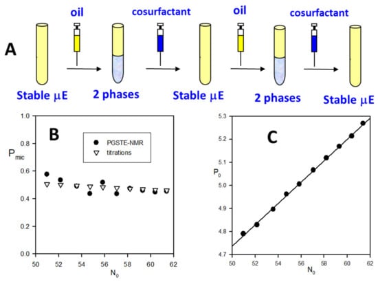 (A) Steps of Schulman’s titration: subsequent additions of oil and cosurfactant, respectively, destabilize and stabilize the w/o μE. (B) The Pmic (fraction of cosurfactant in micelle) vs. N0 (oil/surfactant mole ratio) plot shows how the cosurfactant concentration remains constant during the titration; closed dots are from dNMR experiments while open triangles are from the titration of (C). (C) Representative Schulman’s titration: Po (alcohol/surfactant molar ratio) vs. N0 plot. The straight line is the best fit to Equation (11). The intercept is the minimum cosurfactant/surfactant ratio for the uE and the slope represents the bulk composition; the open triangles of (B) are Pmic = intercept/Po. Adapted with permission from [49]. Copyright (2004) American Chemical Society.