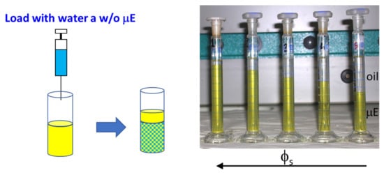 We conclude such an overview introducing a further phenomenology that can be observed loading a stable μE with its dispersed phase. In Figure 6, we present the case of a w/o μE that is loaded with water and, when the water/surfactant ratio exceeds a critical value, the systems expel oil leading to a peculiar phase separation between a dense μE and a very dilute one (almost pure oil). Keeping the water/surfactant ratio constant, the response of the system to a change in surfactant concentration is interesting: at low surfactant concentrations, the system separates, expelling a large amount of solvent (oil). A further increase in ϕs increases the surfactant solubility until a point where only one stable phase is observed [50,51] (sometimes such behavior is called re-entrant phase separation).