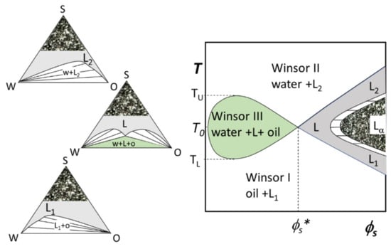 Relaxing the constraint of fixed ϕo = ϕw, the representation of phase behavior of three components requires isothermal ternary phase diagrams like the ones shown in Figure 7 (the reader can find interactive apps to familiarize with this sort of representation on the open-access book by Abbott [54]). Every point within the single-phase region (gray area) corresponds to a different µE composition. At T TU and at T TL, the μEs can also coexist with excess dispersed phase (white lenses in the figures). Any system whose overall composition lies within these two-phase regions will exist as two phases whose compositions are represented by the ends of the straight “tie-lines”. Every point on a particular tie-line has identical coexisting phases but different relative volumes. The phase behavior below TL is characterized by large one-phase regions formed by o/w μE (L1) that in the two-phase region is in equilibrium with almost pure oil. Indeed, all the tie-lines have one extreme in the corner oil. The opposite holds at T above the TU where tie-lines denote a Winsor II equilibrium between almost pure water and w/o μE (L2). The phase diagram at the balance temperature (T0) contains a region corresponding to the Winsor III equilibrium (green). According to the phase rule, at constant temperature and pressure, this region is invariant in composition. This region has, therefore, a triangular shape and any system within is formed by three phases whose compositions are given by the triangle apexes. Moving within such a region does not change the phases composition but only their relative amounts (again, the interested reader is referred to the app [55] from reference [54]).