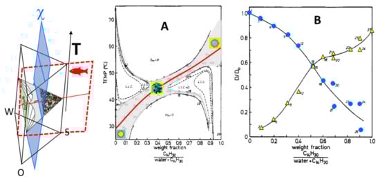 (Left) Example illustrating the ternary phase prism. The “fish cut” at ϕo = ϕw is shown as a red dashed plane; the “χ cut”, defined by a constant ϕs is represented in blue. (A) Experimental “χ cut” phase diagram of the C12E5-water-tetradecane system at ϕs = 17%. The isotropic liquid phase (µE) is shaded in gray and LLC denotes the lamellar liquid crystalline phase. The red curve denotes the composition-T path from o/w to w/o μE. Adapted with permission from [56]. Copyright (1986) American Chemical Society. (B) Relative self-diffusion coefficient of water (blue dots) and tetradecane (yellow triangles). The samples have been collected along the red path in (A). Adapted with permission from [56]. Copyright (1986) American Chemical Society.