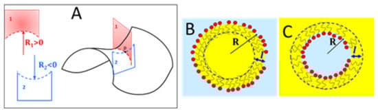 The very narrow channel going from high T at low ϕo to low T at high ϕo, corresponds to the so-called “sponge phase” (usually labeled L3) [23]. In contrast to the bicontinuous μEs that are formed by surfactant monolayers separating oil and water domains, the “sponge phase” is formed by bilayers separating two domains of the same solvent. These exotic μEs could be imagined as the tubular (and interconnected) version of the vesicles sketched in Figure 1C. At higher temperatures and higher water content, a normal, oil-swollen bilayer separates two water domains (labyrinths) that do not have any contact point. Therefore, L3 is strictly a tricontinuous phase with a continuous surfactant–oil domain and two distinct water labyrinths. At the opposite side of the channel (low T and high ϕo) reverse water-swollen bilayers separate two oil labyrinths.