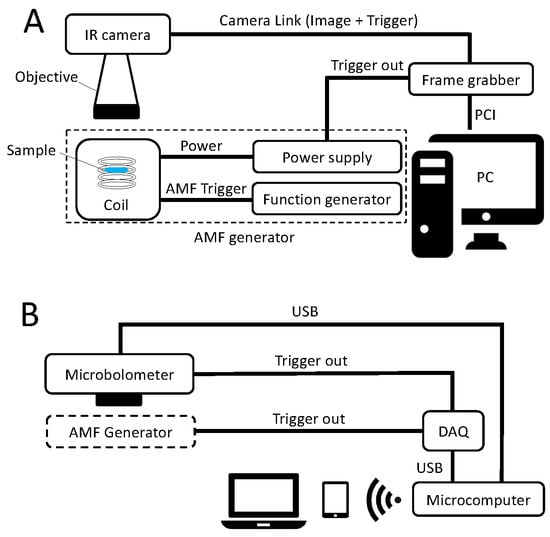 Part A of Figure 1 illustrates the laboratory instrument. The AMF is generated using a coil system (MagnethermTM V1.5, nanoTherics, Warrington, UK) that comprises a function generator (SFG-2004, GW Instek, New Taipei City, Taiwan), a water-cooled coil and a laboratory power supply (EA-PS 3032-20B, EA Elektro Automatic, Viersen, Germany). The output of the AMF is a sine wave which frequency and amplitude can be adjusted. The thermal camera (Onca-MWIR-InSb-320, XenICs, Leuven, Belgium) is mounted on a microscope stand (Leica Microsystems, Wetzlar, Germany) to reduce mechanical vibrations and to allow for a precise positioning. The InSb array (320 × 256 pixels) records infrared radiation between 3 and 5 μm and with a full frame rate of up to 250 Hz. The camera is calibrated by the supplier and provides temperature images. A PCI Camera-Link-based frame grabber card (PCIe-1427, National Instruments, Austin, TX, USA) is used to transfer the temperature images in real time to a personal computer and to generate synchronization triggers which are sent to the thermal camera and to the alternating magnetic field power supply, respectively. The personal computer sets the stimulation frequency via the frame grabber card, while both the thermal camera and the magnetic field power supply are working in slave mode.