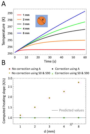 Part A of Figure 3 presents the time-dependent temperature averaged over the whole cuvette area for different cuvette diameters ranging from 1 to 8 mm. Parameters other than d are kept constant in these simulations (l = 2 mm, = 1 Hz, h = 5 W·m−2·K−1 and = 5.05 × 105 W·m−3). If the signal amplitude is unaffected by the size of the cuvette, the larger the area the longer it takes for the temperature to reach quasi-equilibrium. Therefore, a correction for the thermal relaxation time is particularly required for large cuvette sizes. The time-dependent temperature is demodulated to compute the heating slope , which is proportional to the peak power density. Normalization of is achieved by dividing it by the target value set in the numerical model. As demonstrated in Part B of Figure 3, if the thermal relaxation phase is taken into account, can be retrieved accurately independently of the cuvette size. The extended heat source condition is therefore not required, as reported previously [], if the temperature signal is spatially averaged over the cuvette surface area.