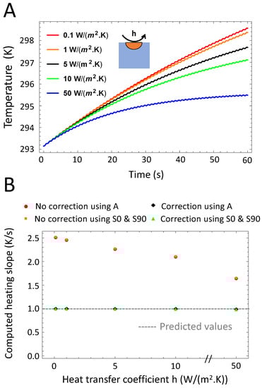 We hypothesized in Section 2.2 that if the total convection, conduction and radiation losses are much larger than the stimulation period, i.e., , the relation between the demodulated signal amplitude A and simplifies to Equation (14). Figure 5 investigates the effect of convection using the convection coefficient h as the major contributor to the total (thermal energy) loss in the sample, L. The higher h the faster the signal reaches quasi-steady state (See part A of Figure 5). Therefore, a compensation is particularly needed for low convection. Nonetheless, we notice from Figure 5B that for h varying between 0.1 to 50 W/(m2·K) and for a stimulation frequency of 1 Hz we remain in the quasi-adiabatic regime and that the heating slope can be computed with high accuracy using the amplitude only.