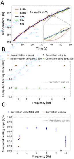 In LIT experiments, the stimulation frequency (also called modulation frequency) is a major experimental parameter. Figure 6 describes the effect of changing the stimulation frequency on the transient surface temperature of the sample and the determination of the heating slope. Changing the frequency from 0.1 Hz to 4 Hz directly influences the signal sinusoidal part without changing the exponential heating in Equation (10) (See Part A of Figure 6). Part B of Figure 6 demonstrates the demodulated heating slope obtained using either and or using only the amplitude signal. Correction of the relaxation phase is necessary at all stimulation frequencies but if achieved leads to an accurate determination of . In a second step we investigated more in detail the influence of the stimulation frequency on the setup sensitivity by adding white noise simulating a camera NETD of 40 mK. The experiment and extraction were repeated in silico 100 times to compute the mean and standard deviation of the extracted heating slope (See Part C of Figure 6). As previously reported in the literature, higher frequencies lead to a higher standard deviation due to a lower amplitude signal []. On the other hand, lower frequencies below 1 Hz are less accurate and they lead to slightly lower mean values. 1 Hz appears to be a satisfying trade-off.