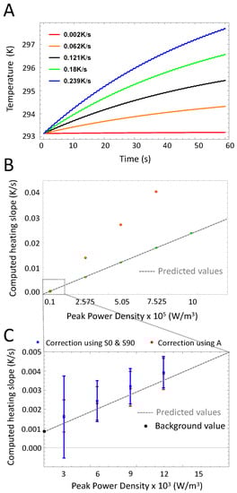 Variations of the heating slope. (A): Time-dependent temperature of the sample for different values of the heating slope. The heating slope influences the duration of the thermal relaxation phase as well as the signal amplitude. (B): Computed heating slope (normalized) for different peak power density. Intuitively, the calculation using the amplitude is preferable in terms of sensitivity due to the ratio in Equation (12). (C): Extended view of the computed heating slope for low power values. Dots represent mean values whereas error bars the standard deviation, computed for 100 measurements. The black dot represents the experimental value of the background signal measured outside the cuvettes.