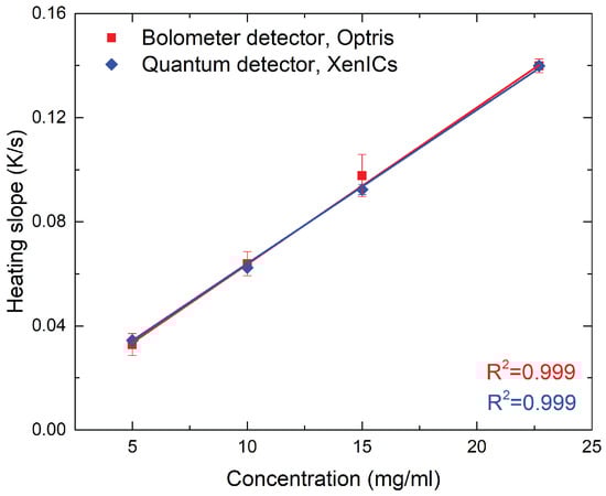 Finally, to assess the performance of the affordable apparatus proposed in this study, 21 nm SPIONs were measured with both setups (see Figure 9). To account for the lower sensitivity of the microbolometer sensor, the measurement time was roughly increased by a factor 17. The heating slopes are proportional with the iron concentration and both devices deliver almost identical values.