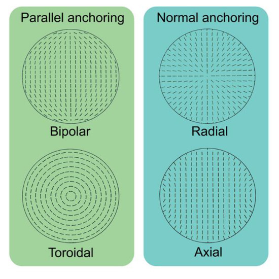 - Erdmann, J.H.; Žumer, S.; Doane, J.W. Configuration transition in a nematic liquid crystal confined to a small spherical cavity. Phys. Rev. Lett. 1990, 64, 1907–1910. [Google Scholar] [CrossRef]