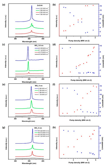 The characteristics of a ZnO nanolaser. (a) Measured spectra of the ZnO nanowires on Al film with the pumping power density from 1.95 MW cm−2 to 3.32 MW cm−2. (b) The corresponding light-in-light-out (red dots) curve and linewidth versus input power density (blue dots) at room temperature. (c) Measured spectra of the ZnO nanowire directly placed on Al film, with a 3.6 nm WO3 layer, and with the pumping power density from 0.48 MW cm−2 to 2.06 MW cm−2. (d) The corresponding light-in-light-out (red dots) curve and linewidth versus input power density (blue dots) at room temperature. (e) Measured spectra of the ZnO nanowire directly placed on Al film, with a 5 nm WO3 layer, and with the pumping power density from 1.19 MW cm−2 to 2.56 MW cm−2. (f) The corresponding light-in-light-out (red dots) curve and linewidth versus input power density (blue dots) at room temperature. (g) Measured spectra of the ZnO nanowire directly placed on Al film, with an 8 nm WO3 layer, and with the pumping power density from 1.24 MW cm−2 to 5.55 MW cm−2. (h) The corresponding light-in-light-out (red dots) curve and linewidth versus input power density (blue dots) at room temperature.