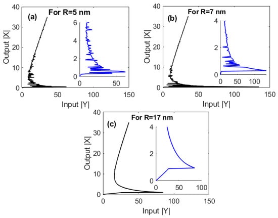 Under EIT conditions, i.e., and , we firstly examine the effects of the edge-to-edge distances between GND and MNP on the output–input relationship, as illustrated in Figure 2. It is remarkable that our proposed hybrid plasmonic system supports the optical multistability due to giant self-Kerr nonlinearity demonstrated by our proposed system, as shown in reference [20]. Obviously, the degree of multistability decreases as increases. With increasing , larger input field is needed to achieve the optical multistability. Specifically, increasing R from 5 nm (Figure 2a) to 7 nm (Figure 2b) leads to increasing the threshold of optical multistability from 20 W cm−2 to 188 W cm−2. Interestingly, these values of the threshold are ultralow compared to those that have recently been obtained for some graphene plasmonic systems [29,39,40]. In fact, increasing the edge-to-edge distances between MNP and GND will lead to increased distances between GND and QD, as noted from Equation (3), which negatively affects the energy transfer between their optical excitations. Interestingly, a switching between optical multistability and bistability can be induced at relatively large edge-to-edge distances between GND and MNP that represent of the center-to-center distance between MNP and GND , as illustrated in Figure 2c.