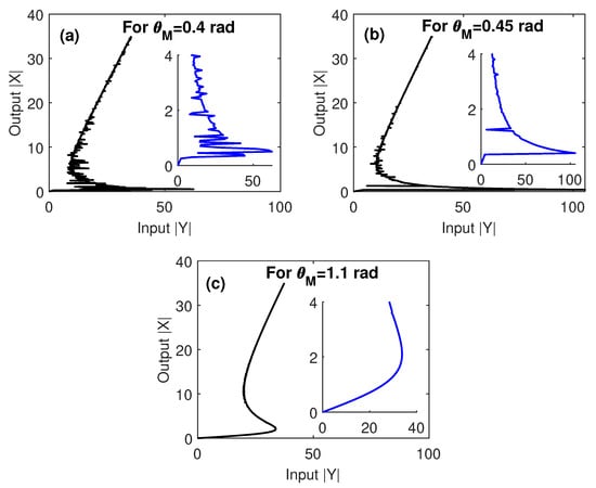 In order to compare the sensitivity of the optical multistability to the geometry of the system via manipulating the edge-to-edge distances between MNP and GND, and the inclination angle of the two components with respect to QD, we checked in Figure 3 the output–input relationship at different values of . We observed that a small led to a large number of loops of multistability with relativity low threshold. As increases, the degree of multistability decreases, while the threshold increases. It is clear that the optical multistability of the MNP–GND–QD hybrid system exhibits high sensitivity to , since increasing the latter by rad leads to doubling the optical multistability threshold. Moreover, a transition between optical multistability and bistability is shown at relativity large , where . This is due to the large center-to-center distances between GND and QD obtained in this case as noted by Equation (3).