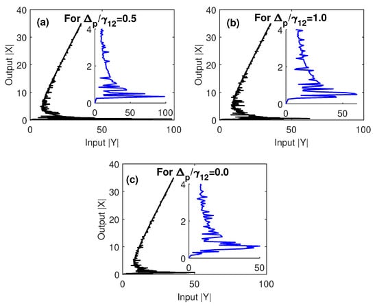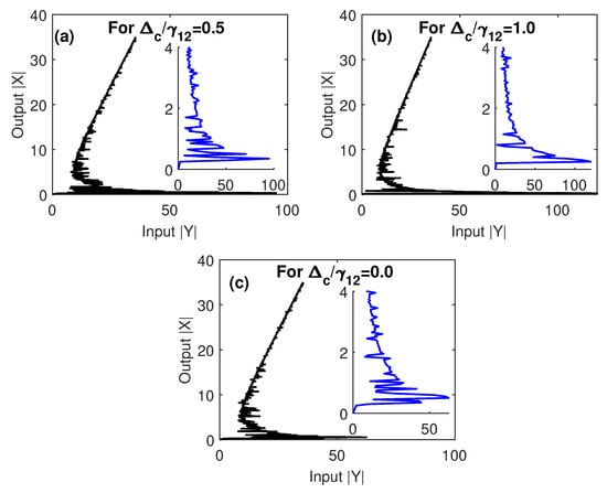 To figure out how the optical multistability of our proposed system can be controlled by the detunings of probe and control fields, we plot in Figure 5 and Figure 6 the relationships between the output and input fields at different values of and . Figure 5 shows the control of optical multistability of the MNP–GND–QD hybrid system by the detuning of the probe field. It is clear from Figure 5c that, when the probe field is resonant with the atomic transition , the threshold of multistability is significantly reduced while the number of its loops is increased. This seems reasonable since a strong coupling between GND and QD is induced at resonance resulting in the enhancement of the nonlinearity of the proposed hybrid system and a reduction in the input field required to trigger the optical multistability. Moreover, if the damping rate of excited state exceeds the detuning of the probe field, the threshold of optical multistability is relatively large (Figure 5a) and decreases as the ratio increases (Figure 5b).