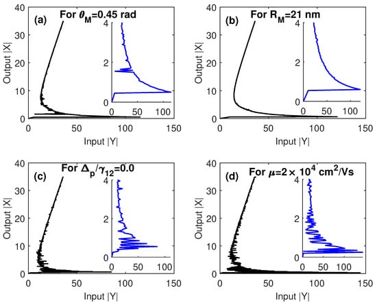 The output versus the input for different values of the mobility of GND under EIT conditions; , and . The other parameters were ; (a–c) ; (d) , nm, rad, rad and .