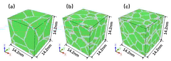 The Voronoi algorithm [20] has been used to generate three nanocrystalline TiAl alloy models with different grain quantities in Atomsk [21]. The geometric model of the molecular dynamics simulation is shown in Figure 1, in which the green and grey parts represent the face-centered cubic (FCC) crystal structure and grain boundary, respectively. There are 10, 30, and 50 grains in each model with the grain sizes in the model being 6.6 nm, 4.6 nm, and 3.8 nm, respectively. Moreover, there are 175,132, 175, 183, and 175,152 atoms in the models, with the size of the models being 14.2 nm × 14.2 nm × 14.2 nm.