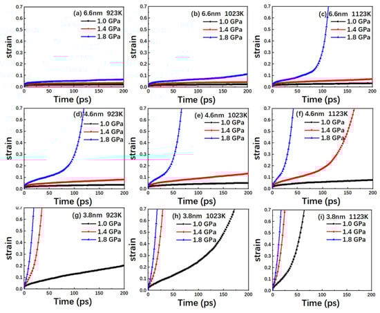 Different stresses (1.0 GPa, 1.4 GPa and 1.8 GPa) have been applied at different temperatures (923 K, 1023 K and 1123 K) in the TiAl alloy model with different grain sizes (6.6 nm, 4.6 nm and 3.8 nm) to obtain the variation of strain with time, as shown in Figure 2. In the creep deformation curve shown in Figure 2, the slope represents the strain rate during the creep deformation process. The creep characteristics can be generally divided into three stages: the initial creep stage, where the strain rate gradually decreases on enhancing the duration and finally flattens out; the steady creep stage, in which the strain rate remains constant; and the accelerated creep stage, where the strain rate increases continuously with time.