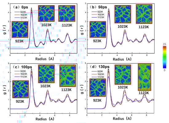 Radial distribution function plots with atomic snapshots of a representative nanocrystalline TiAl model with 4.6 nm coarser grain, colored as per CSP during creep deformation for (a) 0, (b) 50, (c)100, (d) 130 ps under the stress levels of 1.4 GPa at 923 K, 1023 K, and 1123 K.