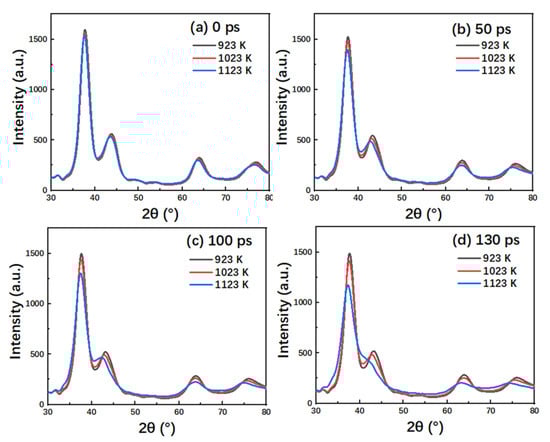 Figure 4 shows the simulated XRD patterns at different times in the creep process of the TiAl alloy at different temperatures. The experimental XRD peaks of TiAl were 37.8°, 43.7°, and 63.7°, respectively [34]. This is corresponding to the peak position in the simulated XRD pattern, while the overall deviation is approximately 1.8°. The reason for the deviation is that MD simulation is limited by the simulation size. In addition, it is not possible to directly compare the strength and width of the XRD peaks of the experimental and simulated samples. The relative strength of the XRD peaks is also related to the crystal quality. At 0 ps and 50 ps, the XRD patterns of the TiAl alloy were almost the same at different temperatures, and the diffraction peak decreased with the increase of temperature, indicating that the FCC phase structure decreased with the increase of temperature. At 100 ps, it was observed that the TiAl alloy was at the end of the steady-state creep stage at 1123 K, and its XRD pattern diffraction peak was slightly lower than that at 923 K and 1023 K, indicating that the FCC phase structure declined slowly in the steady-state creep stage. At 130 ps, the TiAl alloy entered the rapid creep stage at 1123 K, and the maximum diffraction peak was significantly lower than the other two temperature conditions, and the width of the peak became wider, indicating that the crystal structure composition of the TiAl alloy decreased rapidly during the rapid creep stage.