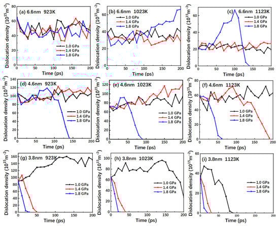 Plots of the dislocation density versus time for the nanocrystalline TiAl models with grain sizes of (a) 6.6 nm at 923 K; (b) 6.6 nm at 1023 K; (c) 6.6 nm at 1123 K; (d) 4.6 nm at 923 K; (e) 4.6 nm at 1023 K; (f) 4.6 nm at 1123 K; (g) 3.8 nm at 923 K; (h) 3.8 nm at 1023 K; and (i) 3.8 nm at 1123 K under the stress levels of 1.0, 1.4, and 1.8 GPa.