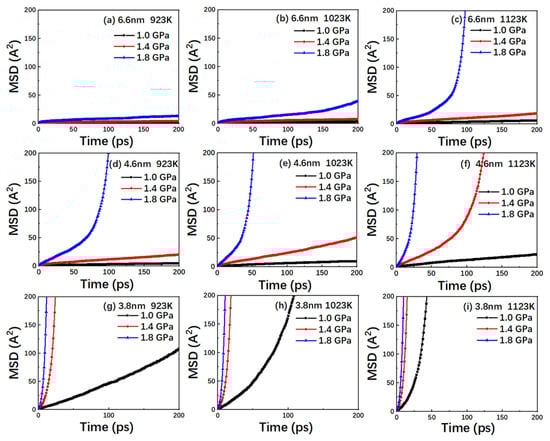 Plots of the MSD versus time for the nanocrystalline TiAl models with grain sizes of (a) 6.6 nm at 923 K; (b) 6.6 nm at 1023 K; (c) 6.6 nm at 1123 K; (d) 4.6 nm at 923 K; (e) 4.6 nm at 1023 K; (f) 4.6 nm at 1123 K; (g) 3.8 nm at 923 K; (h) 3.8 nm at 1023 K; and (i) 3.8 nm at 1123 K under the stress levels of 1.0, 1.4, and 1.8 GPa.