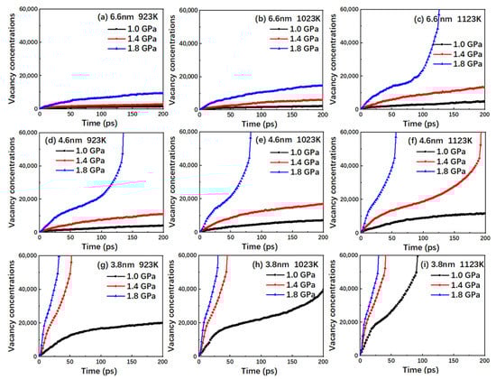 Plots of the vacancy concentrations versus time for the nanocrystalline TiAl models with grain sizes of (a) 6.6 nm at 923 K; (b) 6.6 nm at 1023 K; (c) 6.6 nm at 1123 K; (d) 4.6 nm at 923 K; (e) 4.6 nm at 1023 K; (f) 4.6 nm at 1123 K; (g) 3.8 nm at 923 K; (h) 3.8 nm at 1023 K; and (i) 3.8 nm at 1123 K under the stress levels of 1.0, 1.4, and 1.8 GPa.