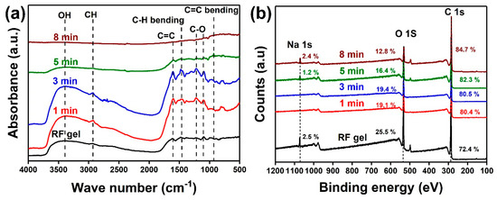 (a) FTIR spectra and (b) XPS survey spectra of OCNs obtained after the time-dependent plasma surface treatment on RF gel at a power:250 W, and flow rate:100:50 sccm.