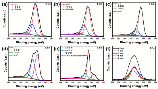 High-resolution C 1s spectra of RF gel and CNs obtained after the time-dependent plasma surface treatment at a power of 250 W and flow rate of 100:50 sccm: (a) RF gel (b) 1 min; (c) 3 min; (d) 5 min; (e) 8 min; and (f) O 1s spectra of RF gel and CNs after each stage of plasma surface treatment.