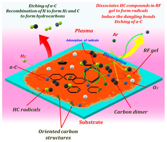 The graphitization of the carbon is enhanced by the removal of impurities and to form a continuous sp2 carbon network by the H atoms present in plasma. However, the etching rate becomes dominant at higher power and gas flow rates, which can create more defects and structural damage [57]. On the other hand, insufficient etching and recombination at a low concentration of gases and low plasma power have resulted in the amorphous carbonaceous structures.