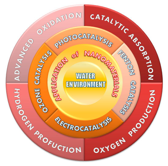 The adsorption catalytic principle of nanomaterials mainly uses part of the cationic keys in the active free radicals such as the surface hydroxyl group and the environment to change its toxicity [66]. This affects the final migration and conversion of pollutants and achieves the fundamental purpose of treating pollutants in water. For example, the large π keys of nanomaterial graphite to polar organic pollutants interact to achieve polar adsorption. Another example is that combining graphite ole with magnetic material iron oxides can have a better adsorption and removal effect on heavy metal ions in water [64,66]. Furthermore, titanium dioxide nanomaterials can absorb organic pollutants through the interaction between superficial electrostatic effects and hydrogen bonds and can degrade their oxidation under ultraviolet exposure.