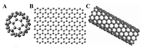 Three different geometrical structures of graphene (GR): (A) ball-shaped GR; (B) a GR sheet; and (C) carbon nanotubes (CNTs). Reproduced [22] with permission from Wiley-VCH, 2016.