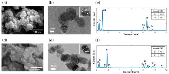 Metal oxide nanoparticles synthesized by anodization. (a) FE-SEM image, (b) TEM image, and (c) EDX spectrum of zinc oxide nanoparticles. (d) FE-SEM image, (e) TEM image, and (f) EDX spectrum of tungsten oxide nanoparticles.