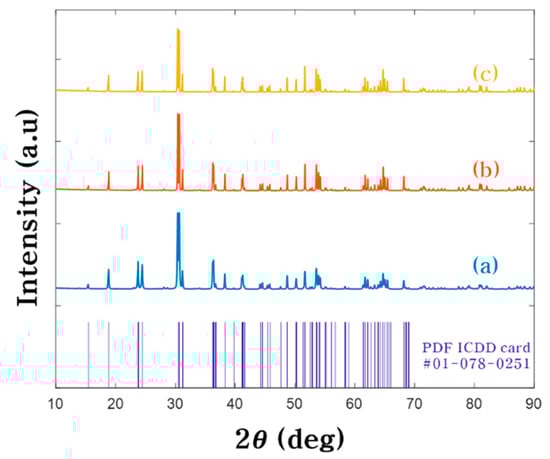 The ZnWO4 powders were fabricated by solid-state reaction at different temperature at 700, 800 and 900 °C. The structure morphology of ZnWO4 powders are showed in Figure 2 by FE-SEM. The ZnWO4 powders were sized through FE-SEM. As a result, the average sizes of powders fabricated at 700, 800 and 900 °C were 176.4 nm, 626.7 nm and 2.127 μm respectively. This phenomenon of particle size increase resulting from reaction temperature elevation can be explained by oriented attachment growth during the solid-state reaction [33]. From a thermodynamics viewpoint, the driving force behind oriented attachment growth is reduction in free surface energy after particle mergence [34,35]. The ZnWO4 powders fabricated at 700 and 800 °C were formed in the wavelength band of light or smaller, and the size of the powders fabricated at 900 °C were formed to micro-sized particles larger than the wavelength of light. Figure 3 shows the XRD patterns of the ZnWO4 powders with an analysis 2θ range 10–90 °C. Comparing the peak value of the XRD pattern with the standard card (PDF ICDD card #01-078-0251), these powders crystallized into pure monoclinic ZnWO4.