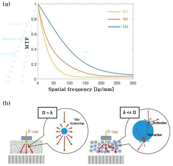 (a) MTF curves obtained from ZnWO4 particles with sizes of (A) 176.4 nm, (B) 626.7 nm, and (C) 2.127 μm. (b) The effect of scintillator size on the spatial resolution of an X-ray image.