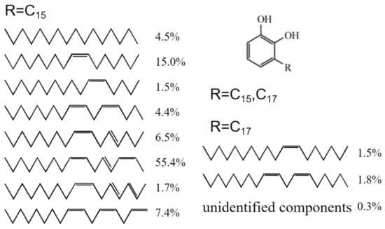 Raw lacquer (RL)βcommonly called as Chinese lacquerβis a natural polymer matrix composite mainly composed of urushiol (60β65%), water (20β30%), gummy substance (5β7%), glycoproteins (2%) and laccase (0.2%) [1,2]. Raw lacquer is an environment friendly material [3] and is also a primitive coating material in China dated to 8000 years ago. Urushiolsβthe main components of RLβare catechol derivatives with either a C15 chain or a C17 chain, in which the double bonds may be in a variety of positions. The positions and proportions of unsaturated double bonds may vary within the side chain [4] (see Figure 1). The unique structure of urushiol endues RL many excellent properties, including high luster, high adhesive force to matrices, dense surface that is anti-percolating, stable heat resistance, chemical resistance, an organic solvent, and great antibiosis [5,6,7]. Hence, RL had been used to coat furniture and handcrafts in ancient China and the heritage lacquerware discovered by archaeologist still retain good condition, which suggests that the RL coating possesses durability performance [4]. Nowadays, RL has been involved in numerous fields such as boats, marines, submerged engineering equipment and automobiles [4]. There have been a considerable scholars investigating the chemical structure and properties of RL as well as conducting studies on the related applications in other fields constantly. Gao et al. found that the presence of hexamethylenetetramine (HMTA) in RL had a positive influence on the performances of lacquer films as it improved the morphology, luster, distinctness of image (DOI), hardness, thermal stability and alkali resistance of the coating membranes [8]. Yang et al. incorporated copper (II)-modified montmorillonite (Cu (II)-MMT) with RL, thereby considerably shortening the drying time of resulting membranes in low humidity while improving the gloss and thermal stability of the membranes [9]. Xu et al. used a water-assisted assembly method to produce urushiol-formaldehyde polymer (UFP) membranes that had a porous structureβand thus good hydrophobic properties and acid and alkali resistance [10]. Wang et al. conducted the interaction between urushiol and methylene chloride in order to synthesize urushiol methylene acetal derivatives which produced valuable leading compounds and further improved the design and development of more effective anticancer agents [11]. Kim et al. used urushiol of RL to synthesize a series of poly (methyl methacrylate)-urushiol polymer composition which were then made into membranes with better thermal stability, highly effective antibacterial and antifouling capacity [7].