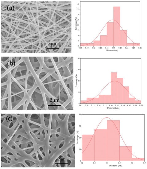 Electrospinning is an efficient technique that produces polymer nanofibers with a diameter between 5 nm and 500 nm [12]. These nanofibers have high porosity, small pore size, a very large surface-to-volume ratio and good physical and mechanical properties, which make them suitable for biomedical, textile, sensor and energy fields. Therefore, they have great potential in related biomedical science and industry [13,14,15]. In recent years, there have been many studies exploring electrospinning, producing a series of novel nanofibrous materials with application value.