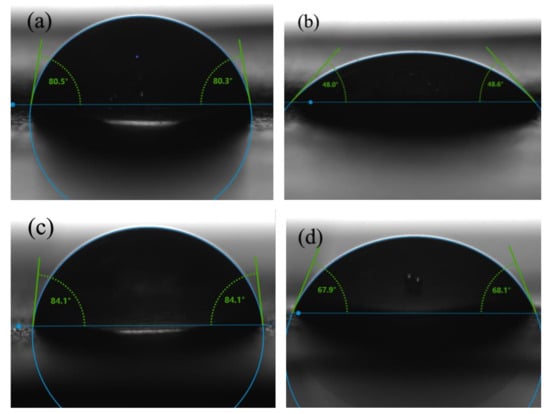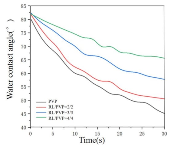 The water contact angle of nanofilms made of different mass ratios of RL to PVP was measured and presented in Figure 6 and Figure 7. When the ratio increased, the change in water contact angle becomes slower. This result was probably ascribed to PVP that was a water-soluble substance. When the nanofilm was in contact with a water droplet, PVP was dissolved immediately whereas urushiol was a hydrophobic material. When the PVP over the surface was all dissolved, the film was then covered by the water repellent material. With the increase of solution RL/PVP content, the denser its internal structure was, the better its water-repellent effect was. Figure 6 shows that the water contact Angle of pure PVP films still remains descending after 30 s while the RL/PVP films exhibit a stabilized water contact angle in 25 s. In addition, Figure 7 shows the difference in water contact Angle between (b) and (d), indicating that the presence of RL improves the performance of PVP nanofilms.