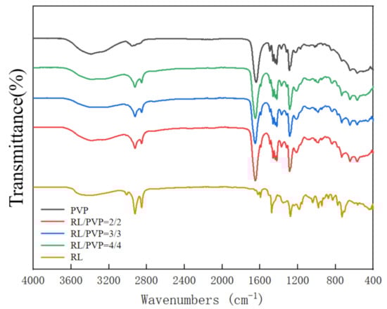 FT-IR spectra of nanofilms as related to the RL/PVP ratio.