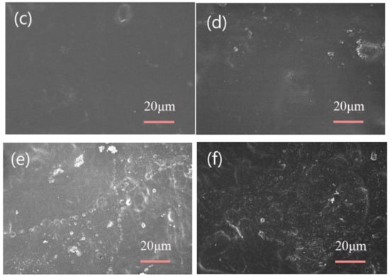 SEM images of nanofilms (RL/PVP = 4/4) after immersion solutions. (a) Deionized water; (b) 20% H2SO4; (c) 40% H2SO4; (d) 60% H2SO4; (e) 80% H2SO4; (f) 100% H2SO. Immersion duration is one hour.