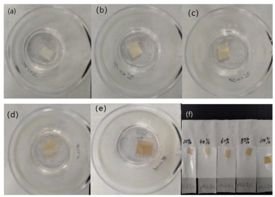 Images of nanofilms (RL/PVP = 4/4) immersed in different acid solutions for 1 h. (a) 20% H2SO4; (b) 40% H2SO4; (c) 60% H2SO4; (d) 80% H2SO4; (e) 100% H2SO; (f) film morphology at different sulfuric acid concentrations.