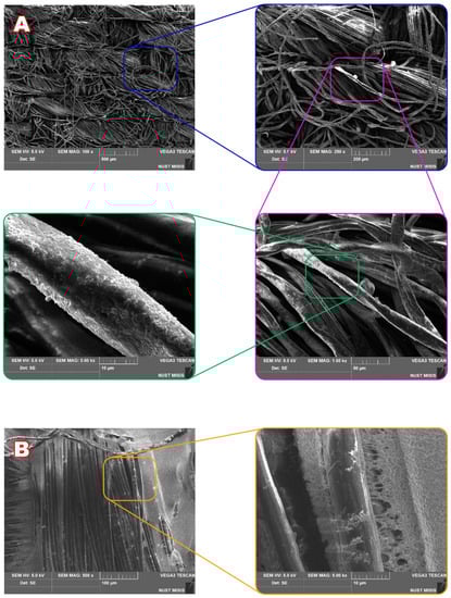 (A) SEM images of the front side of the fibrous material after deposition of TaEtOH nanoparticles. (B) SEM images of the back side of the fibrous material after deposition of TaEtOH nanoparticles. Initial material contained 30% of cotton and 70% of meta polyaramide fiber fabric and is covered by poly(vinylidene difluoride)-co-poly(tetrafluoroethylene) membrane from the back side.