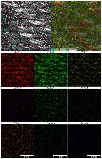 Nanoparticles (for example, of Ta) were regularly distributed on the surface of fibrous material (Figure 2), though Ta aggregates tend to be accumulated in close proximity with phosphate and/or carboxy anions (Supplementary Figures S3–S5). Namely, the least quantity of ‘free’ aggregates (i.e., those which were not superimposed with other elements) of TaEtOH nanoparticles was in the case of oxygen (ca. 20–30%), followed by carbon (ca. 30–40%) and phosphorus (ca. 50%). Co-localization of TaEtOH nanoparticles with other elements issued was sparser.