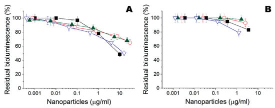 Zn, Fe, and other nanoparticles are known to inhibit bioluminescence of P. phosphoreum and other luminescent bacteria [,]. However, to the best of our knowledge, there is no such information about Ta nanoparticles. Depending on the test microorganism used, variable sensitivity could be achieved [].