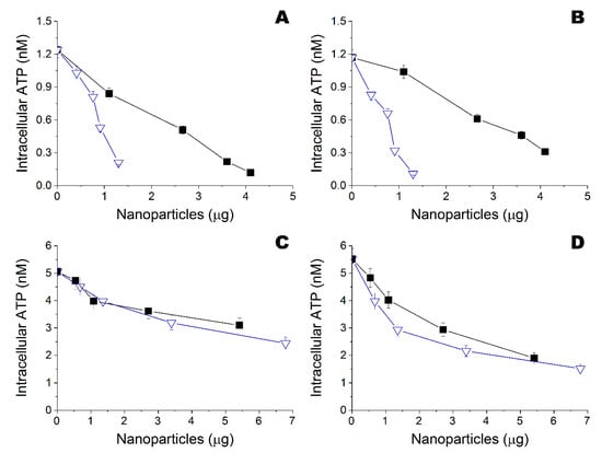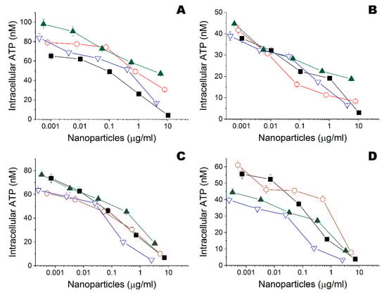 A 100 μL of the cell suspension was added to a 100 μL of 0–10 μg/mL of metal nanoparticles (with preliminary organic solvent evaporation) and incubated at 36 ± 2 °C for 3 h. The minimum bactericidal concentration (MBC) was assumed as the lowest concentration of metal nanoparticles, which completely inhibited the growth of bacteria (i.e., the concentration of intracellular ATP is equal to 0). Benzethonium and benzalkonium chlorides were used as reference compounds in MBC detection. The concentration of intracellular ATP was determined by the known luciferin-luciferase method [] with a Microluminometr 3560 (New horizons diagnostics, Arbutus, MD, USA) using a standard ATP reagent based on recombinant firefly luciferase (Lumtek LLC, Moscow, Russia). The data were linearized in semi-logarithm coordinates []. The mean and standard deviation (±SD) were calculated with SigmaPlot (ver. 12.5, Systat Software Inc., San Jose, CA, USA) from three independent experiments.