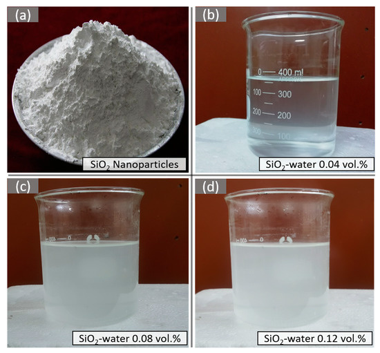 Silica nanoparticles (a), SiO2–water nanofluid of 0.04 vol.% (b), SiO2–water nanofluid of 0.08 vol.% (c), and SiO2–water nanofluid of 0.12 vol.% (d).