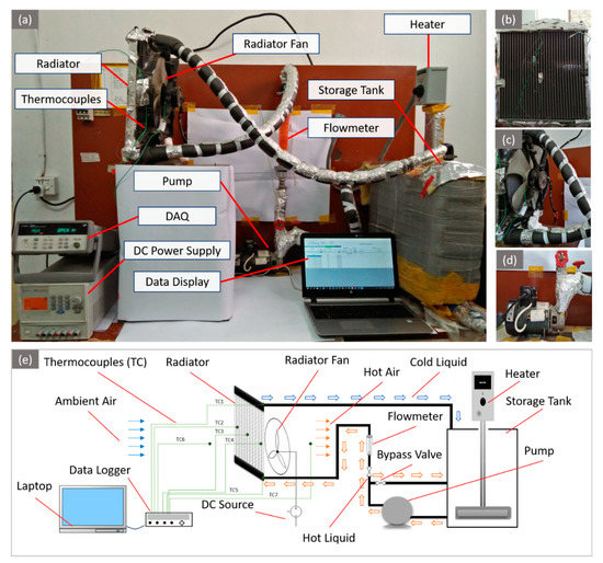 The actual experimental setup and a schematic illustration of the experimental setup used for the current research work are presented in Figure 4a–e, respectively. The experimental setup consisted of a liquid storage tank (533.4 152.4 685.8 mm3); a heater (CH-OTS-604, 240 V, and 6 kW, Chromalox, Inc., Pittsburgh, PA, USA) for the sake of elevating the temperature of the water or nanofluid; a pump (for drawing the liquid from the storage tank and moving it through the loop); a flowmeter (rotameter: Omega FL-45100, Omega Engineering, Inc., Norwalk, CT, USA) for measuring the flowrate of the fluid; gate valves for controlling the flow velocity of the liquid; a vehicle radiator along with a forced draft conventional 12 V fan having 700–800 RPM and 7.1 m/s air velocity for effective cooling of the liquid coolant; a DC power supply (Keysight U8032A, 0-60 V, Keysight Technologies, Inc., Santa Rosa, CA, USA) for the radiator fan; thermocouples (K-type Omega 5TC, Omega Engineering, Inc., Norwalk, CT, USA) for recording the temperatures of the liquid, air, and radiator tubes. Values of temperature recorded by the thermocouples were stored in a laptop through a data acquisition system (Agilent 34972-A, Agilent Engineering, Inc., Santa Clara, CA, USA).