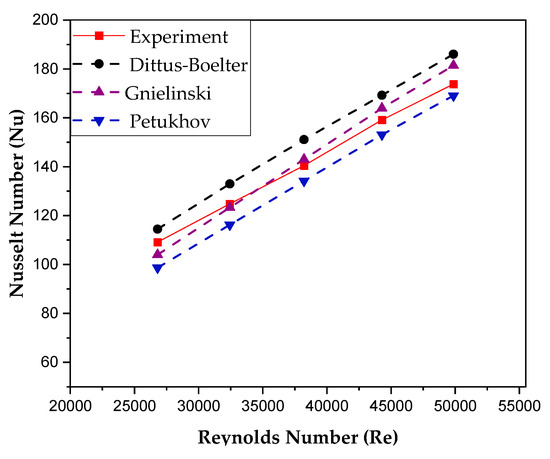 The empirical correlation proposed by Dittus and Boelter [39] (Equation (25)) is the most frequently used correlation for the validation evaluation of setups similar to the current one.