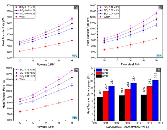Convection heat transfer in the radiator at inlet temperatures 60–70 °C (a–c) and average enhancement in heat transfer rate for SiO2/water nanofluid as compared to the basefluid (d).