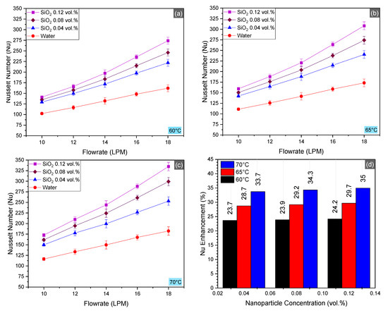 Nusselt number (Nu) in the radiator at inlet temperatures 60–70 °C (a–c) and average enhancement Nu for SiO2/water nanofluid as compared to the basefluid (d).