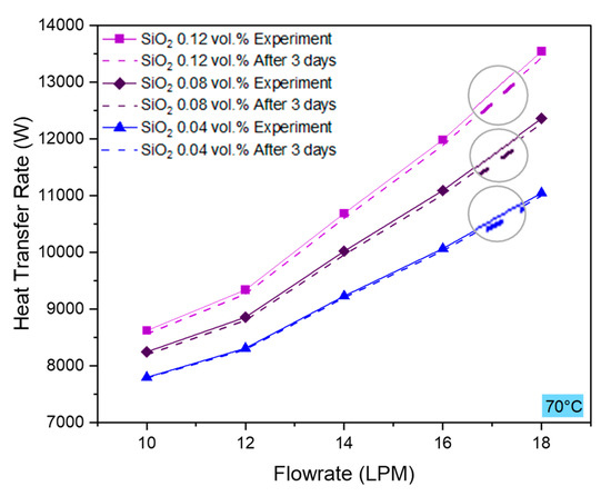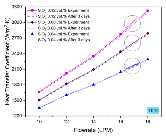 To appraise the precision of our experimental findings, we reperformed the experiments after three days of initial experimentation and observed encouraging heat transfer rate and heat transfer coefficient results, as shown in Figure 11 and Figure 12. Repeatability tests were performed for all the concentrations of nanofluids at 70 °C inlet temperature. Though mere (≤1%), the deviation between initial and reperformed tests increased with increasing the concentration because the presence of a larger number of nanoparticles makes it prone to cluster formation. Nevertheless, agglomeration effect can also sometimes increase the thermal performance if significant thermal percolation phenomenon takes place [60]. Furthermore, the heat transfer coefficient test results presented in Figure 11 represent a decline in heat transfer coefficient as well. A drop in the convective heat transfer coefficient could be attributed to the synergistic effects of clustering and fouling. Fouling is primarily caused by surface wear due to surface rubbing and particle deposition on the bounding surface due to thermal cycles. High flowrate and high concentration of nanoparticles can cause greater wear of bounding surface by the nanoparticles, as observed in Figure 12.